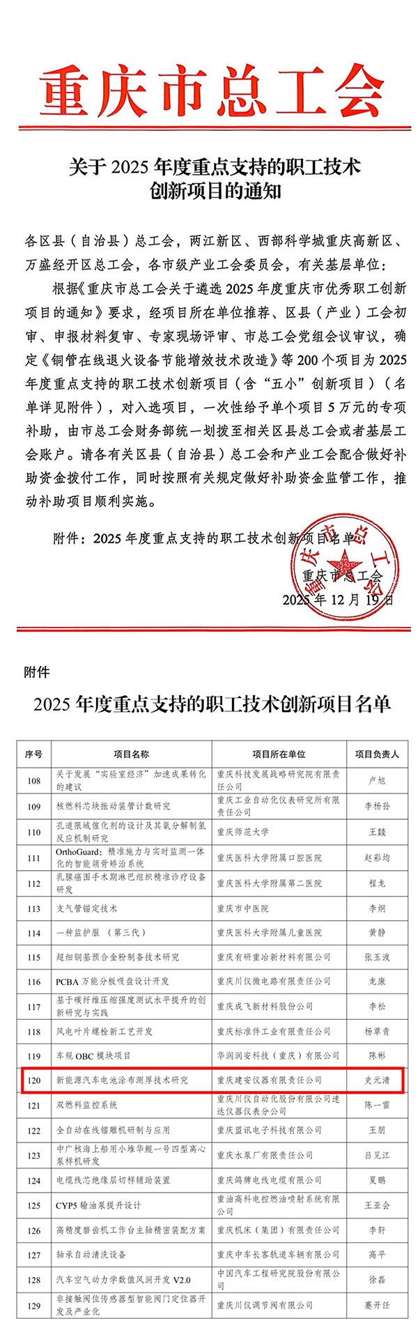 近日,重庆市总工会公布2025年度优秀职工创新项目遴选结果,公司史元清团队牵头的《新能源汽车电池涂布测厚技术研究》成功入选,并获市级专项补助经费5万元。